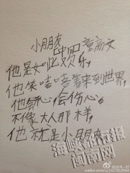 “小朋友经常会有一些奇思妙想,只不过有的没有写下来,有的写下来了却没有被发到网上。”彦文妈妈说,“其实,就这些句子可以算作诗吗?也许只是充满童真的一些句子。”